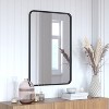 Instantly refresh any room in your home with this 24" x 36" rectangular wall mount mirror. The modern design boasts a slim, matte black metal frame that lends an up-to-date look to almost any decor. HD glass with real silver backing provides high reflectivity for a distortion-free image. Safety minded for today's busy households, the shatterproof backing technology ensures the glass stays put in the frame when breakage occurs to prevent cuts to children or pets. The waterproof and rust-resistant design make this large mirror ideal for use in high humidity areas such as bathrooms, kitchens, and sheltered balconies. Hang this accent mirror vertically or horizontally to suit your personal taste with the included mounting hardware. Wipe clean with a damp cloth to keep your new mirror looking great.
