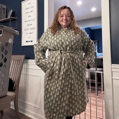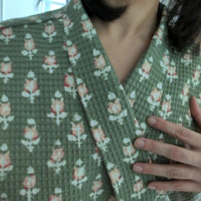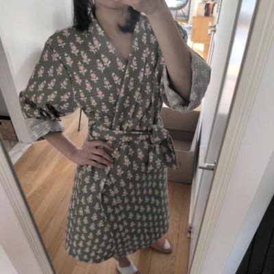 [This review was collected as part of a promotion.] This all cotton robe is so pretty. Instant hot springs Japanese vibe. Could also be cottage even cabin feel. Elevates home tub to a resort or retreat. Great quality natural material and pretty design. Blends in cool toned decor so well. Would also be perfect with wood bamboo warm tones. Great gift for any place!