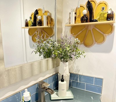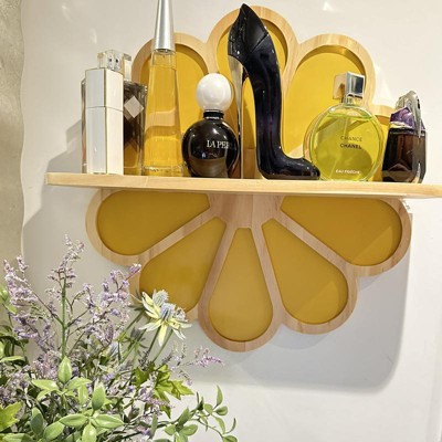 A: The shelf features a blooming floral motif, adding a touch of nature to any room.