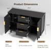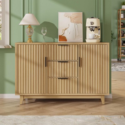 This elegant storage cabinet features a distinctive fluted panel design with black metal handles, blending modern and traditional styles. Its spacious interior (47.2"W x 15.7"D x 31.5"H) includes 2 doors, 3 drawers, and 3-height adjustable shelves for versatile storage. Constructed with durable waterproof MDF and solid wood legs supporting 100 lbs, it includes anti-tip safety mechanisms. Perfect as a sideboard, bar, TV console, or bookshelf in any room. Easy assembly with labeled panels and included hardware. A functional, stylish addition to living rooms, kitchens, or entryways.