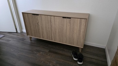 Looks perfect where I have set it up at. Took me a while to finish building but that was because I have a 2 month old who wanted to be held only. lol. Over all, it was probably one of the best purchase. Snatched it when it was on clearance also. We're using this to store our shoes. Can't wait to get some decors and photo frames up.