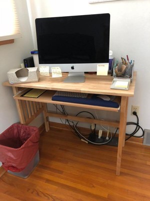 Great desk fits perfect in our corner of the room office space for remote work. Nice neutral wood finish. Keyboard drawer helps reduce fatigue.