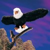 This striking eagle puppet features feather-like brown and white plush fabric and broad, wings can be flapped and the head is movable. His beak and talons are gold-colored velveteen. This puppet is perfect for story-telling, learning the anatomy of fowl, for recognition when learning about the habits of the eagle and its importance to the United States. Puppet measures 14"L x 29"W x 6"H. Surface wash only.