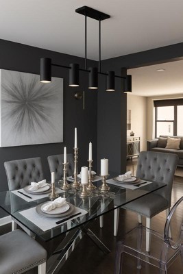 [This review was collected as part of a promotion.] The Foreland 6-Light Matte Black Chandelier from Quoizel is the perfect eye catching statement piece. This light fixture has a unique design that stands out from other linear chandeliers. This light fixture was easy to install and offers a variety of installation configurations including variable drop lengths and hinges to allow this light to even be installed on a slanted ceiling. The matte black color does show dust a bit more but is very easy to clean. The only issue I had with this chandelier was the light output. The light sconces are enclosed and focused downward so the ceiling doesn’t get illuminated very well. The table underneath is very bright but it makes the surrounding area in the room feel darker than a traditional light that points up. This matte black chandelier is a nice way to modernize and reinvent a kitchen or dining room. I have gotten a lot of compliments on its unique design and recommend it to anyone looking to update a linear light fixture.