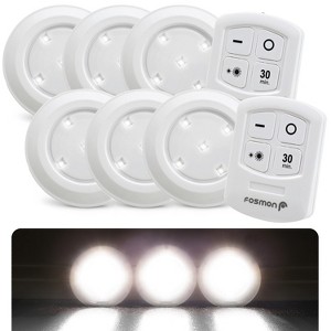 - [5 DAYLIGHT WHITE FLOODLIGHT STYLE LEDS] Fosmon's LED wireless touch light offers a remote-control LED puck style tap light that can be used almost anywhere. Simply install batteries into the light and included a remote control and install. Each light comes with double sided tape, making installation a breeze. The remote control conveniently allows the LED puck light to be operated from afar.
