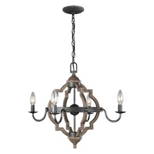 The Socorro four light mini-chandelier in stardust enhances the beauty of your home with ample light and style to match today's trends. The transitional Socorro lighting series by features a classic, barbed Quatrefoil profile - wholly updated by combining a distressed Cerused Oak finish on the decorative silhouette with the rich Stardust finish on the metal bobeches and decorative strapping to create undeniable rustic charm. While still offered in its original finish Stardust, the Socorro has been beautifully updated with our popular Washed Pine and Chrome finish to offer a modern take on this timeless industrial beauty. The collection includes a four-light mini-chandelier, medium and large six-light chandeliers, and four-light and six-light hall / foyer pendants. Incandescent candelabra base lamping.