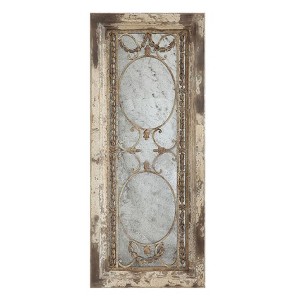 Add character and history to the home with this heavily distressed antique wood wall mirror with metal accents. This rustic and charming wall mirror showcases intricate antique detailing and a heavily distressed finish. The wood frame has a weathered and worn look that adds warmth and texture to the wall, while the metal accents add contrast and elegance. The rectangular shape reflects some light and opens up the space. This wall mirror is ideal for adding character and history to any living space, such as a living room, bedroom, or hallway. Hang it on its own or as part of a gallery wall. This wall mirror comes with hanging mechanisms for easy installation. It can be hung horizontally or vertically, depending on the preference. This wall mirror is made of wood and metal, making it sturdy and durable. It measures 22 inches long, 1.75 inches wide, and 51 inches high, making it a perfect size for any space. This mirror is a stunning piece that will add a touch of sophistication to any home.