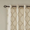 The Madison Park Saratoga Fret Print Panel is the perfect addition for a casual and stylish update to your home decor. This window panel features a trendy metallic gold fretwork on a soft beige ground, creating a simple yet modern look. The cotton blend basket weave fabric softly filters the perfect amount of sunlight into your home, while providing texture for natural appeal. Gunmetal grommet top detail makes this panel easy to hang, open, and close throughout the day. Fits up to a 1.25" diameter rod. Pattern position may vary per panel due to random cutting of fabric.