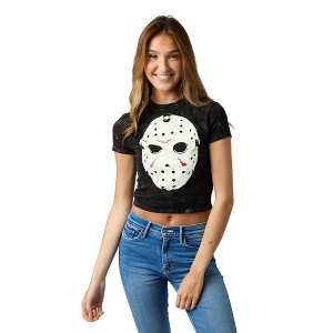 Add horror icon style to your look with this women's gray mineral wash Friday the 13th crew neck short sleeve t-shirt. Featuring a large graphic of Jason's iconic hockey mask, this tee brings bold, slasher-inspired flair to your wardrobe. Made with breathable cotton, it delivers soft, all-day comfort. Machine wash it on cold with like colors and tumble dry on low heat. Use only non-chlorine bleach when needed. Do not iron. Do not dry clean.