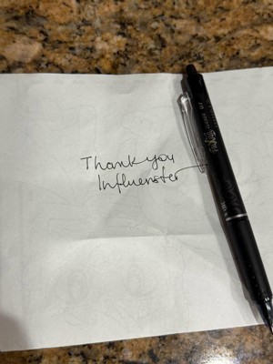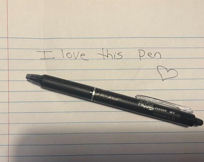 [This review was collected as part of a promotion.] I haven’t bought erasable pens in years because I thought they sucked. This was far superior to any erasable pen I’ve used. The ink came out smooth instead of streaky like some others. The color wasn’t as black as my non erasable gel pens but you wouldn’t notice that by itself. I liked that they made it a clicker because I hate losing caps. You do however click the clip on the side rather than the top which is different but functions well. The grip itself is soft and comfortable. The weight is good and feels nice in your hand. The eraser works well. It will leave a slight trace of the original writing but if you write over that space it’s not at all noticeable. I’m going to buy some more of these for my school aged boys because they like to write in ink but make a lot of mistakes they need to correct in their work. My eldest has stolen mine from my desk several times and liked it as well.