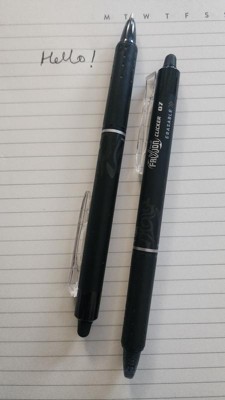 [This review was collected as part of a promotion.] These pens are great for an erasable pen. They write well and erase without a trace, but they do not write a super dark black unless you write slowly. I don’t mind the unique look of the ink, but I wouldn’t call them a favorite. These erasable pens use heat to make the ink disappear so make sure not to use these for important documents, but if you do need the ink to return, pop the item in the freezer!