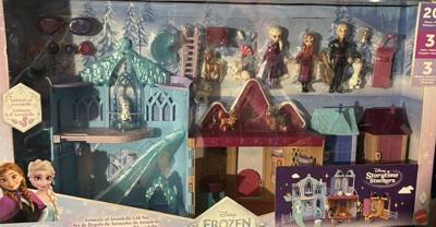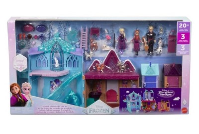 A: This set includes 3 small dolls (3.5 inches) Anna, Elsa and Kristoff, plus 7 woodland animals: a squirrel, bunny, elk, baby reindeer, lynx and 2 foxes, an Olaf figure and 16 accessories. Main playset opens to more than one foot wide and includes 10 play areas in 2 distinctly different "worlds": an icy playground and a cozy cabin! Two additional stackable Arendelle village playsets each have doors that open and close and even more room inside for storytelling fun. Kids can use the fence pieces to connect all 3 playsets together. They will love re-creating playtime stories in the outdoor swing, ice slide and animal elevator, then imagining relaxing in the cabin with the cozy spinning fireplace and carrot chute.