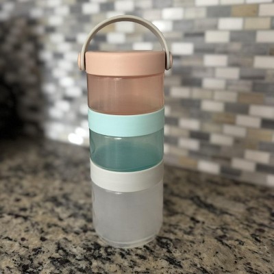 [This review was collected as part of a promotion.] Got this for my toddler to keep her various snacks. She can’t yet untwist it on her own but it’s easy enough for me to do it. Can hold a good amount of snacks in each container. Soft colors for any gender.