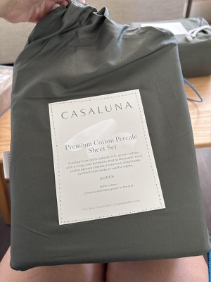 Elevate your bedroom with this Percale Sheet Set from Casaluna™. This four-piece bedding set includes one fitted sheet, one flat sheet and two pillowcases, all crafted in a solid shade for a refined touch. Each piece is made from 100% cotton with a 400 thread count for comfortable use and can be tossed in the washing machine for quick and easy cleaning.