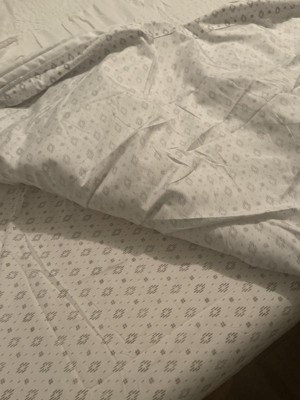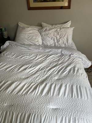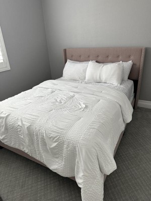 [This review was collected as part of a promotion.] I received the MadisonPark Essentials Nimbus Complete Comforter Bedding and Sheet Set. The set I received is the 7 piece full set. This set includes 1 comforter, 1 flat sheet, 1 fitted, 2 pillowcases and 2 shams. The comforter and shams are a light grey color and the pillowcases and sheets are white with a grey pattern. Everything is made well. However i did notice some long strings inside my shams. But i easily cut the stings down. There is a simple textured line design on top of the comforter and shams. The comforter is soft on top and slightly slippery on bottom. The problem I had with the comforter is being it has no air flow. I felt cold at first when using because if the material then I got hot quickly. The sheets and pillowcases have a nice pattern but also have a slightly slippery feel to them. I love that the set can be machine washed. But I noticed that the bedding set does wrinkle easily. This is a nice set I'm sure many would like for there bedroom.