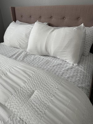 [This review was collected as part of a promotion.] I just love fluffy, comfortable bedding to sleep on. This bedding set is exactly that! When I first opened the package the sheets and comforter were flat. I shook them out and they started to take their normal shape. After washing and drying the sheets were soft and the comforter was fluffy and soft. I love the the color scheme. The sheets and pillow cases are a nice white color with a grey pattern while the comforter and shams are a soft grey color. They match very well. I can't wait to get into bed each night and snuggle up with the comforter. It is the most comfortable bedding set I have ever slept in!