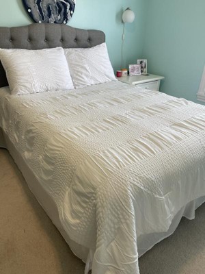 [This review was collected as part of a promotion.] I was really surprised that this was a complete comforter, set with your fitted sheet, flat sheet, comforter, shams, and pillowcases. In general, this comforter set looks good. It has a neat smooth and textured design on the comforter. The sheets and pillowcases are decorated in a brownish gray, circular design but overall are white. The shams are similar to the comforter in texture. The quality of the comforter is good, however, there are many stray pieces of thread along the sewn in portion. The comforter itself provides enough comfort for spring and summer time. The comforter is not to heavy. It’s very light and gives you just enough warmth. This comforter can be used in any room from a dorm, a guest room, or a primary bedroom.