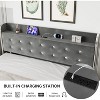 Elegant Design: Diamond-tufted headboard adds a touch of luxury.Built-in Charging Station: Includes AC socket and dual USB ports for device charging.Ample Storage: Four fabric-lined drawers on casters for easy storage and access.Noise-Free Support: Strong wood slats eliminate the need for a box spring.Easy Assembly: Comes with labeled parts, instructions, and tools for simple setup.