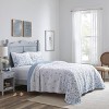 The charming Laura Ashley Flora quilt set boasts a delicate cascading blue floral pattern on a white ground. The flowers are densely printed at the bottom of the quilt and slowly scatter away from one another towards the top of the quilt. This gorgeous quilt reverses to a blue and white diamond pattern. Prewashed for softness, this 100% cotton quilt set becomes cozier with each wash. Filled with a blend of 80% cotton/20% poly it is light weight yet can be layered for year-round use. Set includes one quilt and two shams for full/queen and king size, one sham for twin size. Machine washable for easy care.
