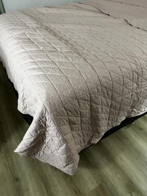 This has been perfect for my daughter’s room glow-up for back-to-school. It’s more of a blush pink color with a slight pearlescent tint. It’s not too heavy but just enough to be warm. I think it fits on her full-size bed perfectly but might be too short on the sides for a queen. So far has held up well with washing, which is a plus for anyone who uses this with young kids.