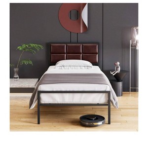 - Sleek Modern Headboard: The bed frame features a simple yet elegant square-stitched headboard design that seamlessly complements various home decor styles, offering both comfort and ease of maintenance.Noiseless & Sturdy: The sturdy metal frame, combined with EVA material to reduce friction between slats, ensures noise-free sleep by accurately connecting joints, eliminating disruptive sounds during use.Space-Saving Design: The queen size platform bed stands approximately 10.8" off the floor, providing convenient extra storage space, making it ideal for compact or limited spaces, ensuring practicality and functionality.Box Spring Optional: With the option to place a mattress directly on the bed frame slats, users can forgo the need for box springs, offering cost and time savings. This queen size bed frame is compatible with mattresses ranging from 8 to 14 inches in height, offering versatility and convenience.Easy Assembly: All components are conveniently packaged in a single box, enabling quick and straightforward assembly of the queen bed frame within approximately 30 minutes. Customers can also access support for installation assistance.