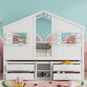 Full Size House Loft Bed with Roof, Four Storage Drawers, and Safety Guardrails