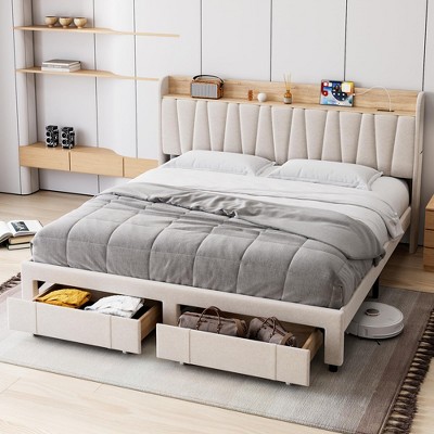 Combining functionality and style, this full-size upholstered daybed is the perfect addition to any living room, guest room, or bedroom. With two built-in drawers for storage, it’s a space-saving solution ideal for storing toys, bedding, or other household items. Upholstered in soft, beige linen fabric with a diamond-tufted backrest and rivet-accented armrests, this piece adds a touch of elegance and warmth to your home décor. Crafted with a durable wood frame, this daybed is designed for long-term use without the need for a box spring.