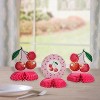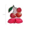 Sweeten the look of table displays with these stylish centerpieces! This set of three centerpieces features images of brightly ripened cherries with stems and a green leaf and pink coloring in the background. Each image sits on top of a bright pink honeycomb tissue paper base. With simple assembly to set them up, these centerpieces can decorate guest tables, an entryway table, photo booth background or food display. Simple assembly required. © OTCbr