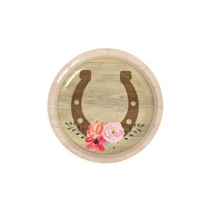 LUCKY ONES: Celebrate your favorite cowgirls when you use these homey plates, perfect for bachelorette parties, weddings or horse-themed birthdays. Each plate features a lucky horseshoe and beautiful flowers against a shiplap design. br