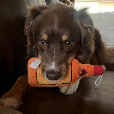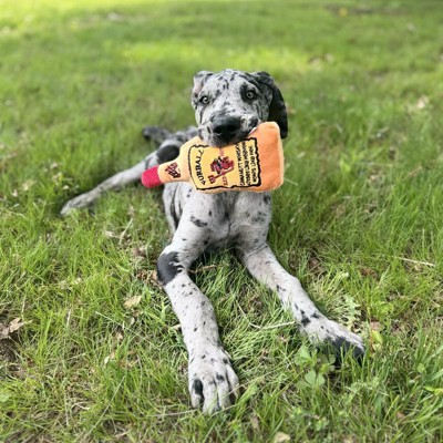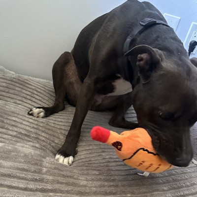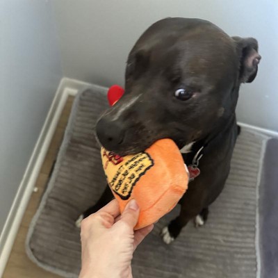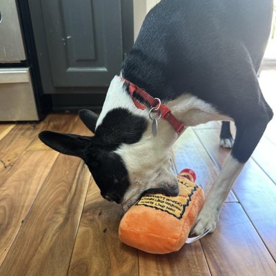[This review was collected as part of a promotion.] My dogs were begging for this toy as soon as they saw it. The toy is durable, with thick fabric and strong stitching. The squeak is not loud and annoying. It’s a great size for their mouth, like a small animal. It crinkles with every bite which really keeps them interested. It’s a very punny toy, and I definitely get a kick out of it. Normally my dog goes straight to gutting all his toys, instantly, but doesn’t seem to with this one for some reason. So I’m hopeful it’ll last longer than most toys I get for him. He’s been squeaking it for the last 20 minutes and tried to bury it, it’s a fun time. I received an incentive to write this review.