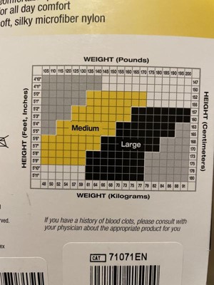 A: Great question! If you look under the photo, you should see a section below saying "About this item", you should then see light gray writing that states Size Chart. You will select that and it should inform you of the height and weight sizes for the medium and large Futuro Opaque Tights.