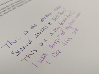 [This review was collected as part of a promotion.] Smooth ink, vibrant variety of purples, and very comfy grip. Perfect for notes, journaling, or adding flair to everyday writing. Reliable, vibrant, and bold—my go-to pen every time!