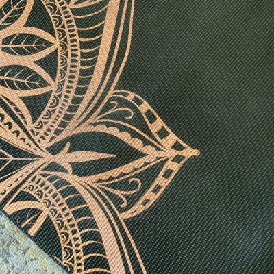 The print is more bronze than gold and it runs off with sweat. It’s a thicker mat, which I like but I’m bummed about the print transferring off.