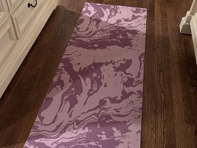 [This review was collected as part of a promotion.] This is a gorgeous yoga mat! I love the purple color, the pattern and the length of the mat. It was rolled up so tightly that the end will not flatten completely but I expect that will go away after awhile. It does roll up very compact for easy storage and transport. This mat is thinner than others that I’ve used but it still has a good amount of cushion and will be great for exercises that require being on your knees.