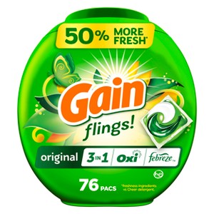 - Includes one 76 count tub of Gain Flings Laundry Detergent Pacs in the iconic Gain Original scent