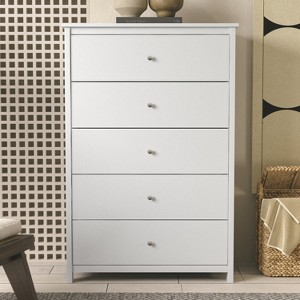 The Galano 5 Drawer Chest offers practical vertical storage for bedrooms, guest rooms, or apartments where space matters. Designed with a tall, streamlined profile, it features five spacious drawers that provide room for clothing, linens, and everyday essentials while helping keep surfaces clutter free. The chest is made from manufactured wood with a finish that highlights natural wood grain variation, giving it a warm, versatile appearance. Metal drawer knobs add a simple finishing touch, and a tip-over restraint device is included to support added stability when secured as directed. With an overall size of 31.3" W × 15.6" D × 47.7" H, this chest is a smart solution for organizing smaller spaces without sacrificing storage capacity.