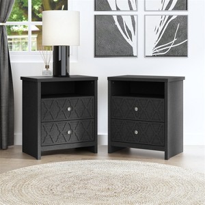 Complete both sides of your bed with this set of two modern nightstands from Galano. Designed with a clean rectangular silhouette, each nightstand blends easily with many bedroom décor styles. The open shelf offers space for books or decorative pieces, while two smooth-gliding drawers help keep smaller essentials organized and out of sight. Made from durable manufactured wood with simple metal handles, each unit provides a stable surface that supports up to 24 lbs—ideal for lamps, clocks, or nighttime items. The combination of open and enclosed storage makes these nightstands a helpful addition to bedrooms of all sizes. Measuring 26.8" H, each piece works well with standard or taller beds. The set assembles easily with the included instructions for a comfortable setup experience.