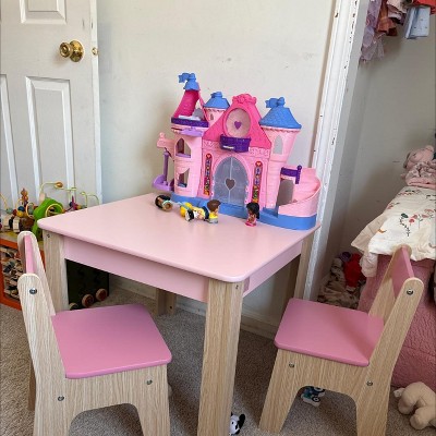 Overall, really happy with purchase. Furniture seems well built and stable. Was very easy to assemble. Love the two-tone pinks and wood tones. Probably won't use the bar for paper rolls until my toddler learns to not take it off. Perfect size and gift for my 20 month old. There is a large logo on the side of the table, which was unexpected, but it doesn't bother me. My toddler immediately colored the top with crayon and it washed off with a Clorox wipe and elbow grease. If it gets really banged up in the future, I plan on repainting it, which is why I went with wood instead of a plastic set.