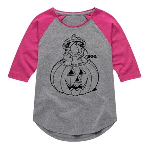 Garfield - Boo Pumpkin - Toddler And Youth Girls Raglan Graphic T-Shirt - Bring the humor and laziness of the famous orange cat to your wardrobe with Garfield graphic apparel. Featuring Garfield, Odie, and Jon, these designs celebrate the iconic comic strip and its beloved characters.