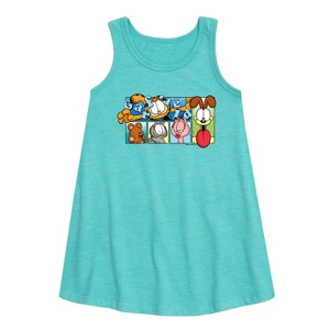 Garfield - Character Grid - Toddler and Youth Girls A-line Dress - Bring the humor and laziness of the famous orange cat to your wardrobe with Garfield graphic apparel. Featuring Garfield, Odie, and Jon, these designs celebrate the iconic comic strip and its beloved characters.