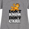 Garfield - Don't Know Don't Care - Toddler And Youth Girls Fleece Dress - Bring the humor and laziness of the famous orange cat to your wardrobe with Garfield graphic apparel. Featuring Garfield, Odie, and Jon, these designs celebrate the iconic comic strip and its beloved characters.