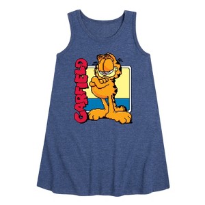 Garfield - Garf Pixel Square - Toddler & Youth Girls A-line Dress - Bring the humor and laziness of the famous orange cat to your wardrobe with Garfield graphic apparel. Featuring Garfield, Odie, and Jon, these designs celebrate the iconic comic strip and its beloved characters.