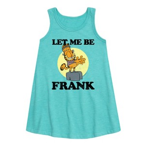 Garfield - Let Me Be Frank - Toddler and Youth Girls A-line Dress - Bring the humor and laziness of the famous orange cat to your wardrobe with Garfield graphic apparel. Featuring Garfield, Odie, and Jon, these designs celebrate the iconic comic strip and its beloved characters.