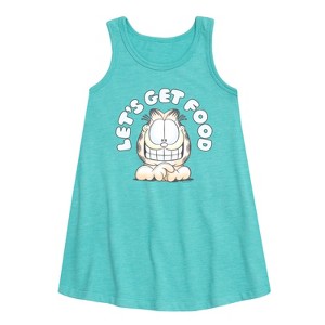 Garfield - Lets Get Food - Toddler & Youth Girls A-line Dress - Bring the humor and laziness of the famous orange cat to your wardrobe with Garfield graphic apparel. Featuring Garfield, Odie, and Jon, these designs celebrate the iconic comic strip and its beloved characters.
