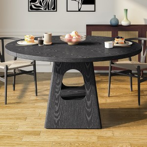 This 47-inch round rustic dining table combines farmhouse charm with practical functionality. Designed for family gatherings, it comfortably seats six and features a sturdy solid wood base for long-term stability. The built-in lower shelf adds storage convenience, while the circular tabletop suits dining, crafts, or casual activities. Easy to assemble and beautifully finished, this table brings warmth, versatility, and timeless style to any dining area.