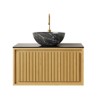 This modern wall-mounted bathroom vanity combines elegance with functionality. Featuring dual ceramic basin options, a black sintered stone countertop, and a Corolla oak veneer plywood cabinet, it delivers both style and durability. The deep storage drawer with soft close slides provides ample space, while pre-assembled construction and secure mounting hardware ensure easy installation and long-lasting stability.