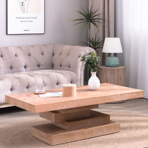 Add modern rustic elegance to your living space with this rectangular coffee table featuring a sculptural tiered pedestal base. Crafted from durable manufactured wood, it combines long-lasting strength with a warm natural wood-look finish. The spacious tabletop offers ample room for décor, drinks, or everyday essentials, while the architectural base creates a striking focal point. Designed for both style and functionality, this versatile center table enhances living rooms, lounges, or office seating areas with timeless appeal.