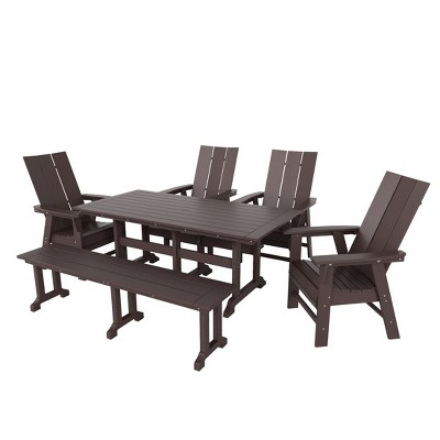 This 7-piece outdoor dining set showcases a rustic style with its matte antique finish, bringing timeless charm to any patio or garden. Built from high-density polyethylene (HDPE), it ensures all-weather performance, resisting rust, fading, and cracking for long-term durability. Its sturdy construction features a reinforced table and six armless chairs that provide reliable strength and stability. The slatted design enhances airflow and prevents water buildup, combining functionality with classic appeal. Perfect for outdoor dining, this set offers effortless assembly and enduring comfort for everyday gatherings.
