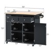 This versatile kitchen island features a built-in power outlet, making it easy to power appliances while cooking. The drop-leaf design offers extra counter space when needed, and the rubber wood construction ensures durability. With open storage and a wine rack, it provides ample space for kitchen essentials and bottles. The island is mounted on 5 wheels for easy mobility, and its adjustable storage allows you to customize the space to suit your needs. Perfect for enhancing functionality and style in your home, this kitchen island is both practical and stylish.