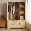 This farmhouse-style wardrobe features a natural wood tone and clean four-door design that brings warm rustic charm with modern practicality to bedrooms or apartments. A smart motion sensor light automatically illuminates the interior when doors open, improving visibility and everyday convenience. The half-length mirror allows quick outfit checks while visually expanding the space, complemented by sleek black metal handles. With large capacity storage, including hanging space, shelving, top storage, and two spacious drawers, it keeps clothing and accessories neatly organized and easily accessible.
